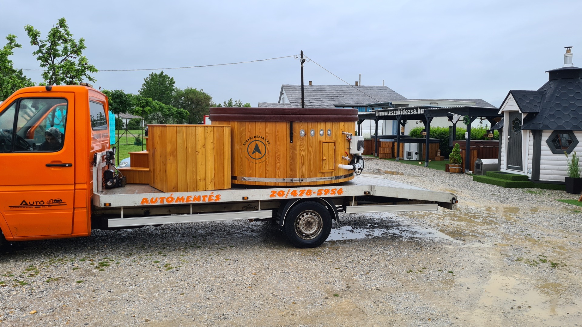 Hossza: 110 cm, szélessége: 60 cm, magassága: 62 cm. Tömbösített borovi oldalfal, impregnált, bordázott fedél. Víztisztító berendezés, fűtőpatron, sóbontó elfér alatta.
